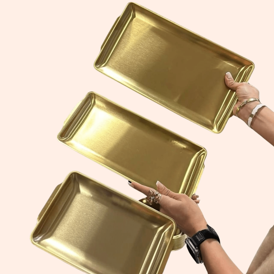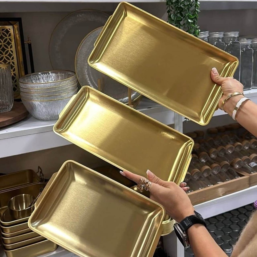 طقم سيرفيس استانلس مدهب 3 قطع بشكل مستطيل، مثالي لتقديم العشاء، الحلويات، والسوشي، مصنوع من فولاذ مقاوم للصدأ وبأحجام مختلفة لتلبية جميع احتياجات المائدة.