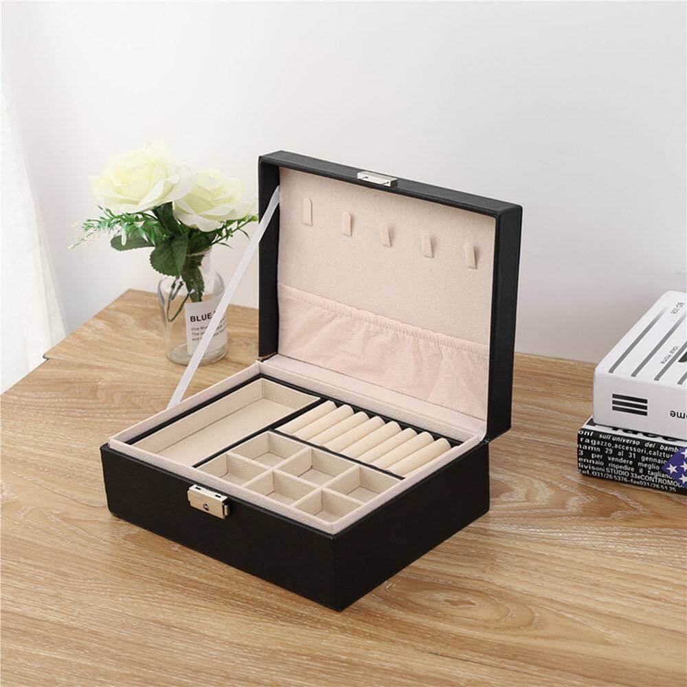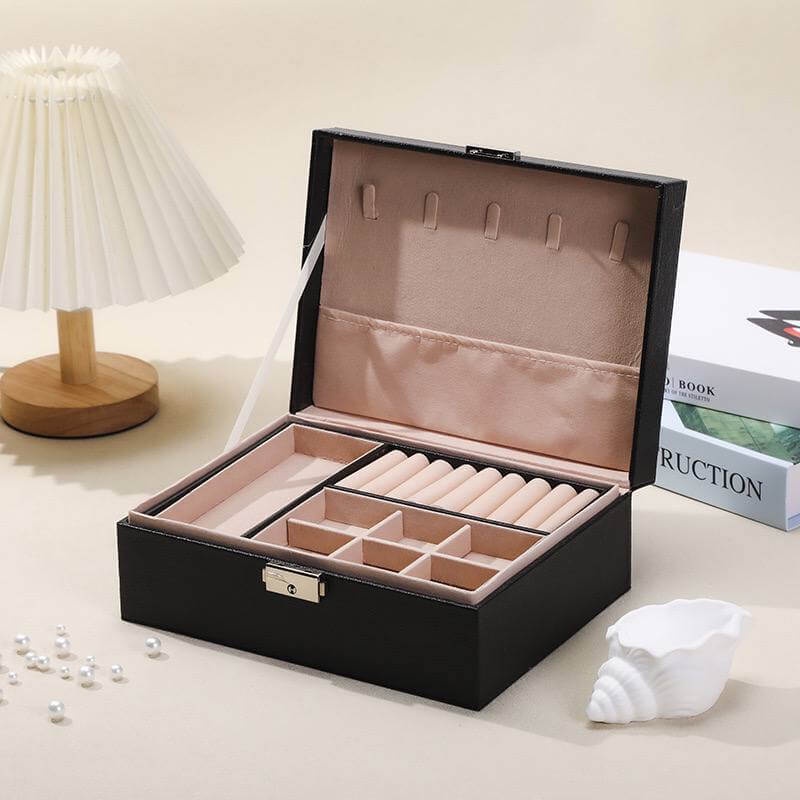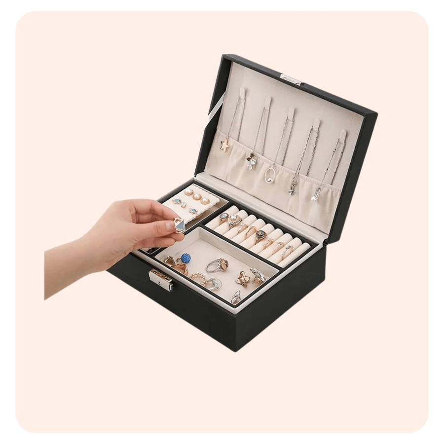رتّبي إكسسواراتك بسهولة مع منظم الجلد الأسود. يحمي المجوهرات من التشابك ويجمع كل شيء في مكان واحد، صغير وعملي لأي درج أو دولاب.