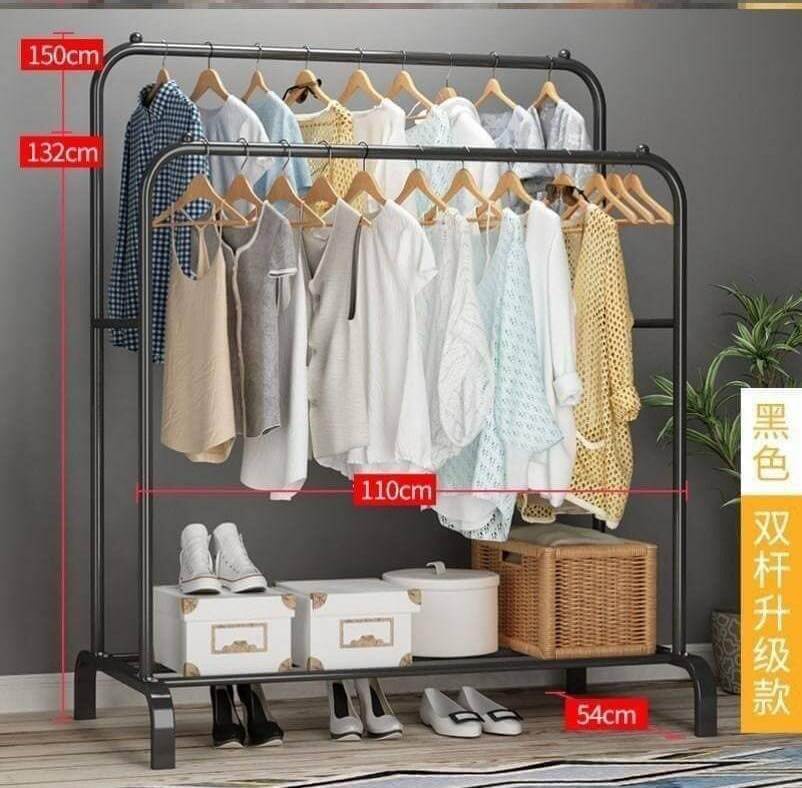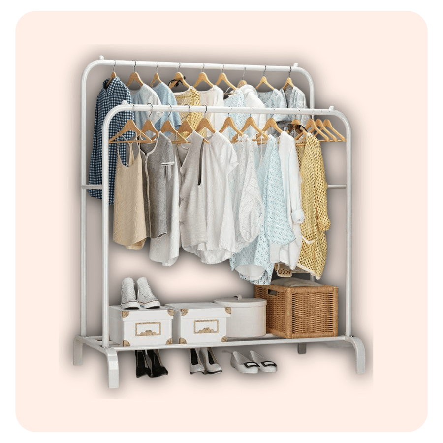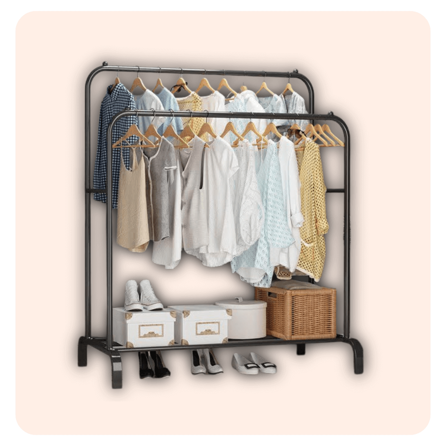 استاند ومنظم ملابس مزدوج خامة معدن فورجيه تقيل، يتحمل حتى 35 كجم، مزود برف لتنظيم الملابس والشنط والأحذية، تصميم عملي وأنيق.