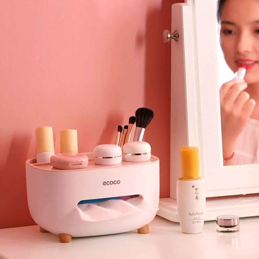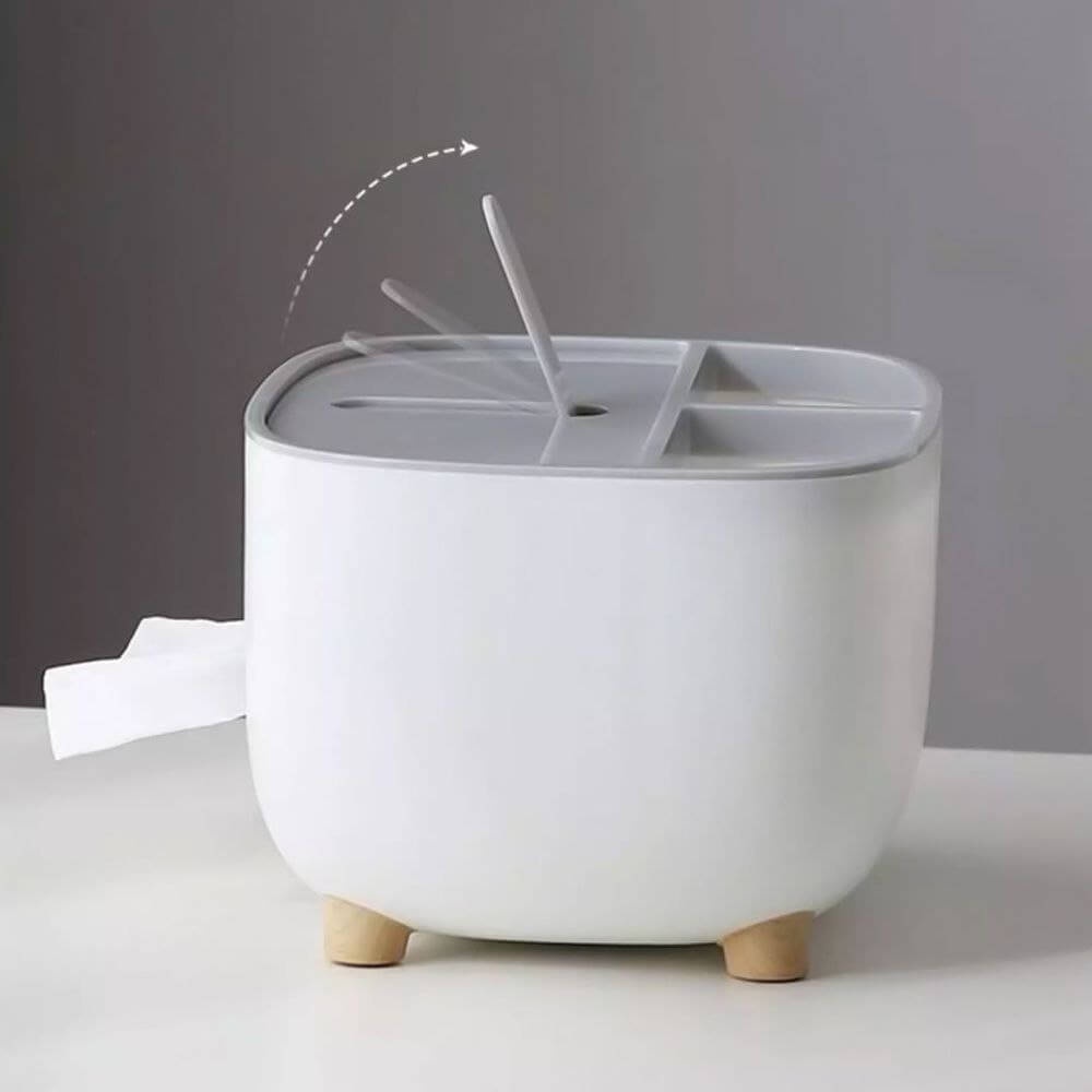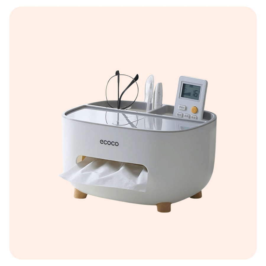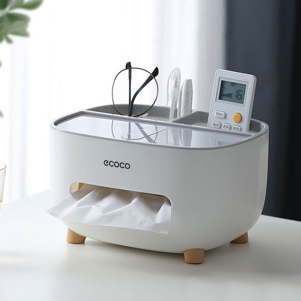 نظّم منزلك مع علبة مناديل Ecoco بارجل خشب متعددة الاستخدامات، تحتوي على منظم للريموت وخانة للتسالي، تصميم عملي وأنيق لمنزلك.