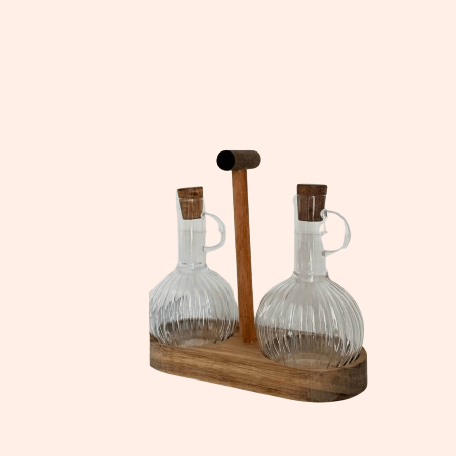 طقم زياته بيركس 2 قطعة مزود بحامل خشب بامبو أنيق، مثالي لتقديم الزيوت بطريقة عملية وراقية في المطبخ أو على السفرة.