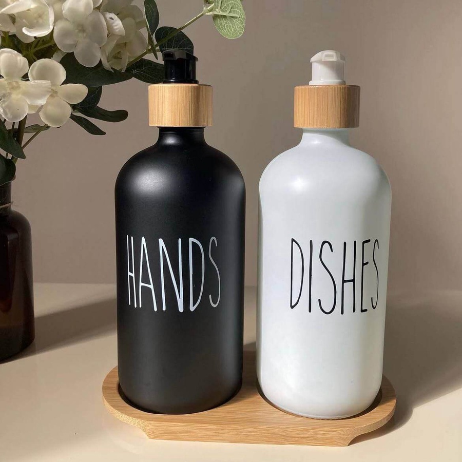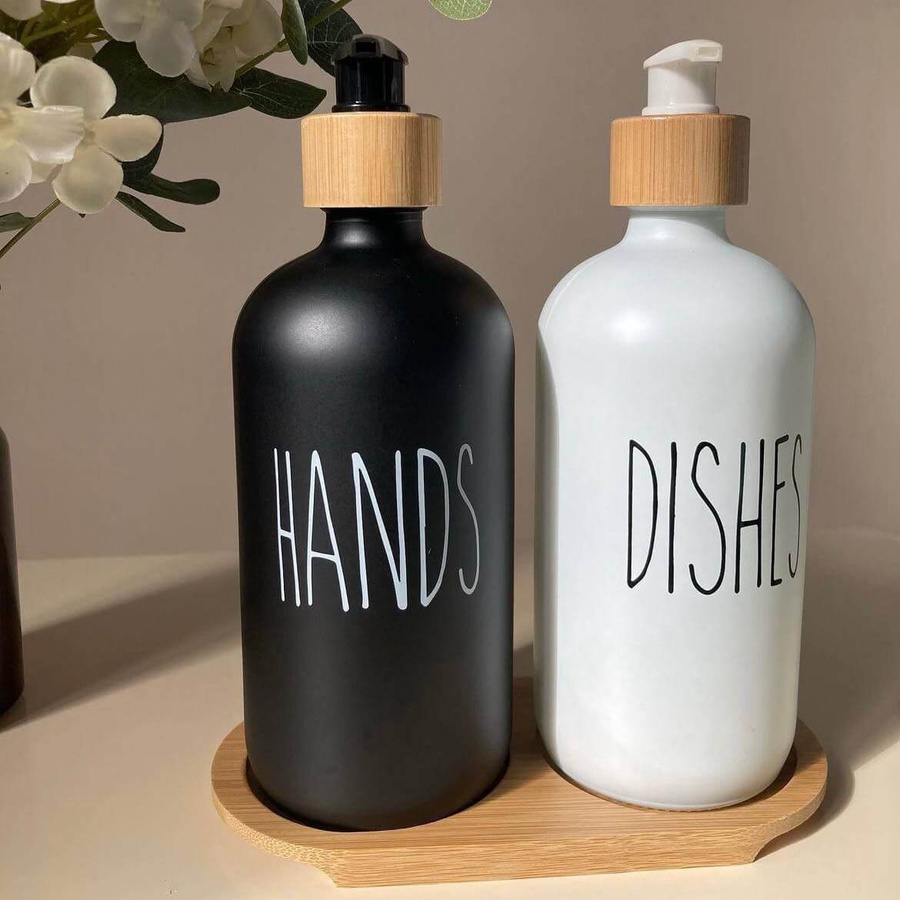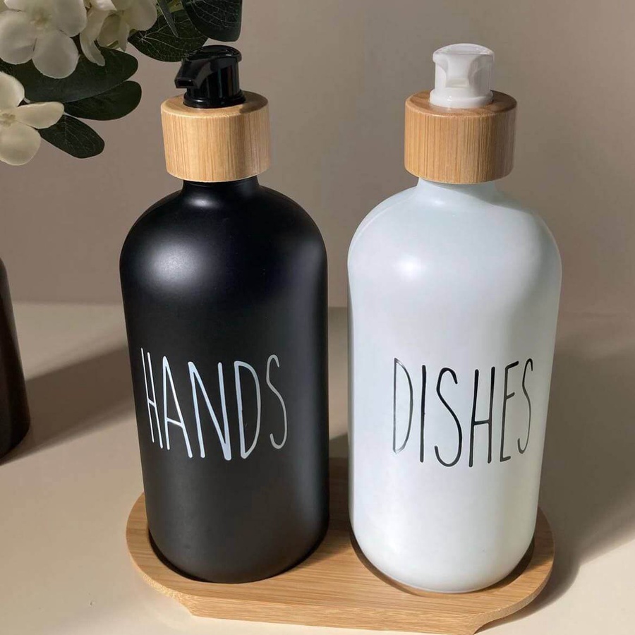 طقم الشاور شي إن أنيق وعالي الجودة، دسبنسير زجاجي مع حامل خشبي بسعة 500 مل، يضيف لمسة جمالية وعملية لحمامك.