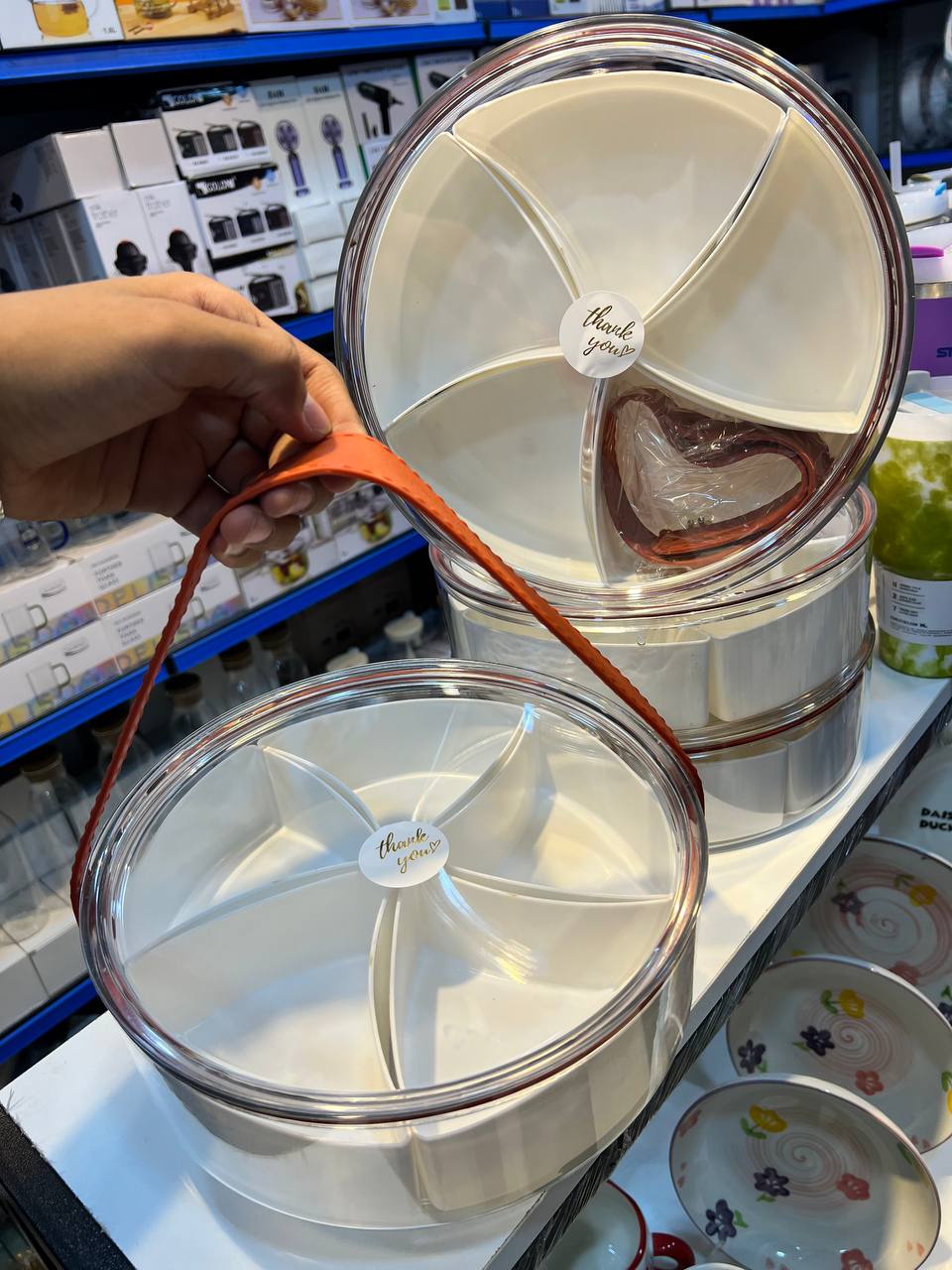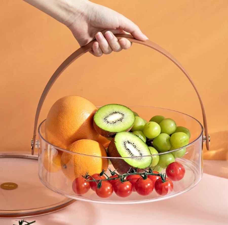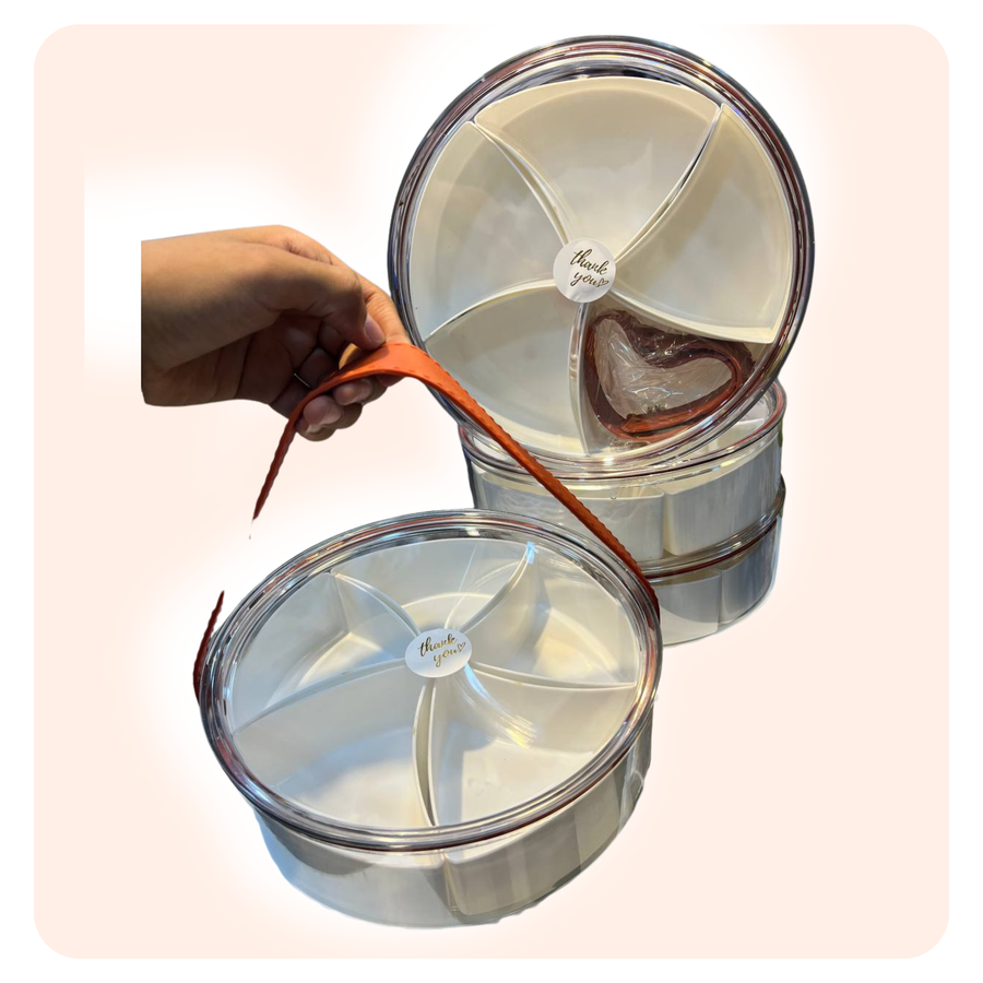 طبق تقديم حلويات أنيق من الأكريليك، بيد شبيه للجلد ومقسم من الداخل، مثالي للضيافة أو تقديم الفواكه والتسالي بشكل مرتب وجذاب.